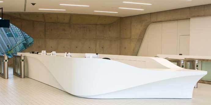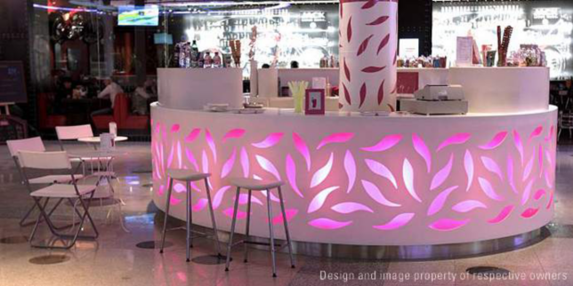 Associant polyvalence et pragmatisme, le Corian® sera votre fidèle partenaire pour l’agencement de vos espaces de commerce. Parce qu'il est thermoformable, il peut s'adapter à n'importe quel espace aussi étroit soit-il ou créer une profonde impression. Parce-que le Corian® est un matériau massif, il peut être marqueté ou découpé à volonté pour reprendre l’identité visuelle des entreprises et des magasins. Parce qu'il est translucide, il peut être rétroéclairé pour renforcer son impact visuel. Ce matériau noble peut être utilisé pour créer des façades de magasins, des murs, de la signalétique, des comptoirs, des zones de contrôle et des présentoirs pour quasiment tout type d’environnement commercial.